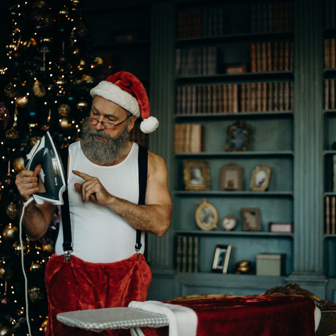 Don't be like our friend Santa trying to press his garments at the last minute! Bring your Christmas outfits to us for a professional